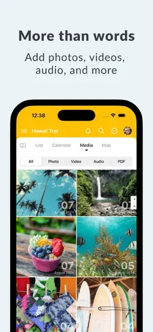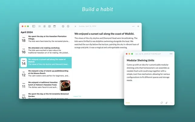 Day One은 전 세계 1,500만 회 이상 다운로드되며, Apple의 올해의 앱으로 선정된 디지털 일기장입니다. 이 어플은 텍스트, 사진, 오디오, 비디오 등을 안전하게 기록하고 보관할 수 있도록 도와줍니다. 직관적인 디자인과 사용 편리성으로 일기 작성 경험을 한층 향상시킵니다.