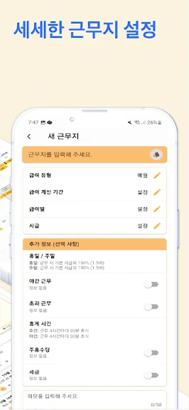 2. 야간 근무와 초과 근무, 휴게 시간 등을 세밀하게 설정할 수 있어 정확한 급여 계산이 가능합니다.