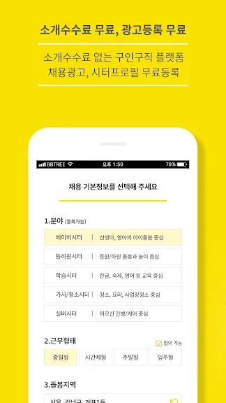 앱을 사용하기 위해서는 지역, 일정, 시급 등을 상세히 설정해 원하는 시터를 쉽게 찾을 수 있습니다. 면접 제안도 버튼 클릭 한 번으로 간편하게 할 수 있어 돌봄 구인부터 관리까지 모두 손쉽게 처리할 수 있습니다. 또한, 시터의 근무 일지는 자동으로 기록되어 편리하게 관리할 수 있습니다.