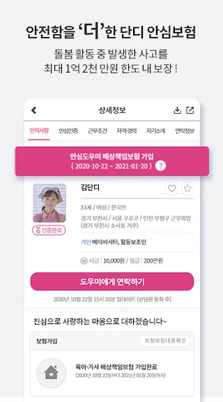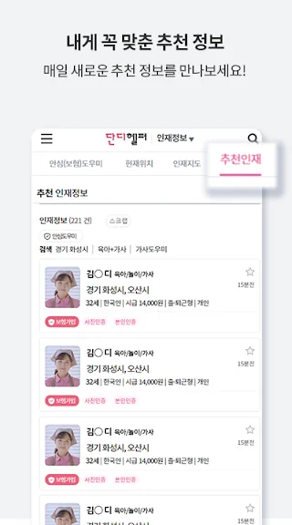 아래는 단디헬퍼-베이비시터 / 가사도우미 전문 구인구직 어플에 대한 스크린샷 정보입니다.