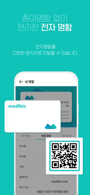스마트폰 하나로 내 명함을 전달하고, 받은 명함을 관리할 수 있는 전자명함서비스 모디빅!