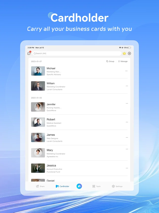 - BCR의 자체 스토리지인 Card Holder는 편리한 명함 검색과 연락처 분류 및 그룹화 기능을 제공합니다. 필요한 연락처를 신속하고 쉽게 찾을 수 있습니다.