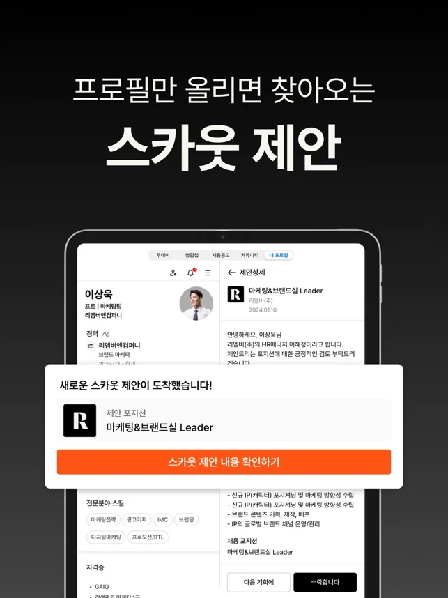 - 프로필만 등록해도 스카웃 제안을 받을 수 있어요.