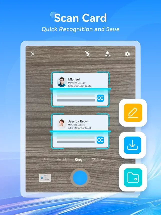다국어 명함을 빠르고 정확하게 식별 할 수 있으며, 주소록에 명함 정보를 자동으로 저장합니다.