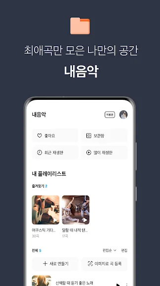 - 내 플레이리스트는 물론, 최근 들은 곡, 많이 들은 곡, 좋아요 곡 등을 한번에 관리 가능