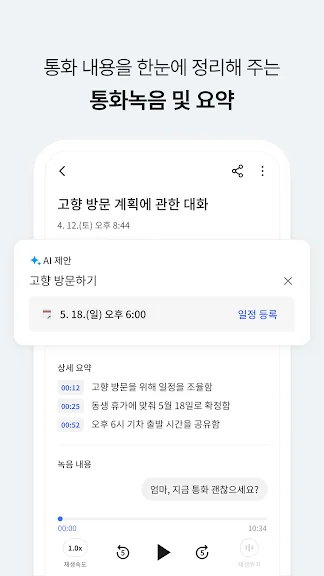 AI가 추천하는 대화 주제를 볼 수 있고 통화 직후 방금 한 통화 내용을 요약하고 통화에서 언급된 할일과 일정을 카드 형태로 모아서 알려줍니다.