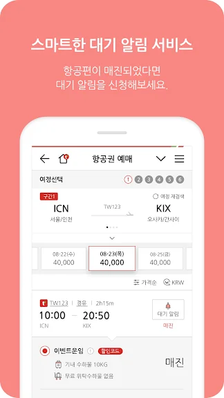 [가격 알림] 예산에 맞는 항공편을 찾지 못하셨나요? 지금 최저가 알림을 설정하시면 항공권이 목표가격으로 떨어지는 즉시 알려드립니다.