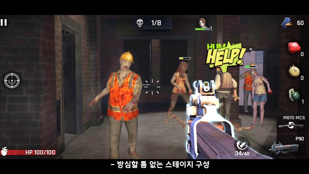 좀비와의 사투에서 승리하기 위하여 강력한 캐릭터와 무기 업그레이드를 진행하세요!