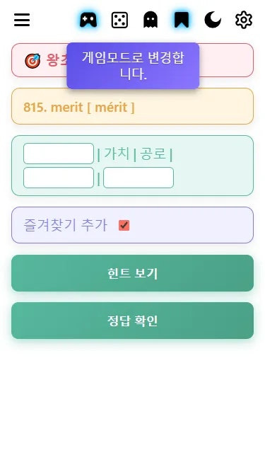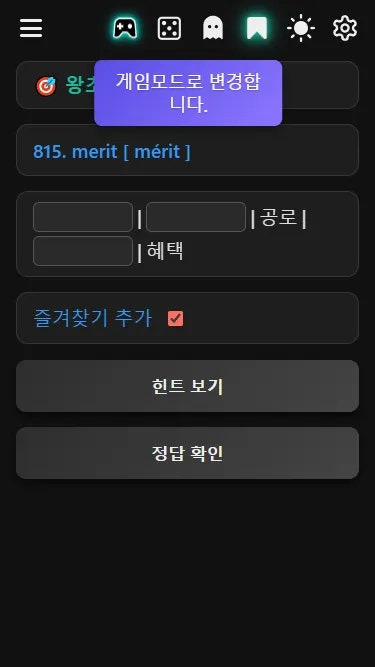 5) 상단의 게임 아이콘을 클릭하면 퀴즈모드로 바뀝니다. 정답의 내용 일부가 가려지며 인풋박스에 정답을 입력하여 정답이 맞는지 틀린지 확인가능합니다. 힌트보기를 클릭하며 초성을 알려줍니다.