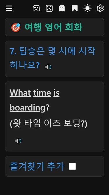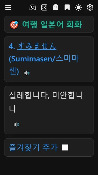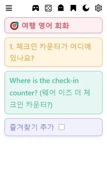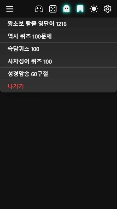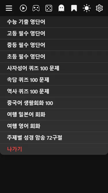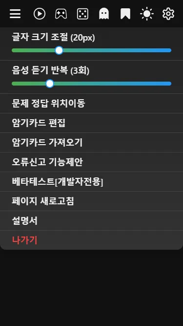 암기수첩을 초기에 열면 위와 같은 이미지가 반길것입니다. 상단의 초생달 아이콘 또는 태양 아이콘 을 클릭하면 다크모드 또는 라이트 모드로 변경됩니다.