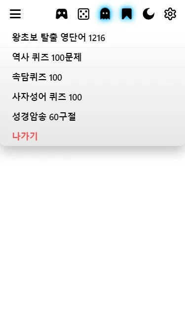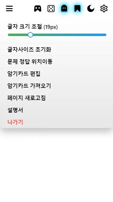 4) 상단의 유령 아이콘을 클릭하면 정답을 안보이게 하며 한번더 클릭하면 보이게 됩니다. 외운 내용을 확인할때 사용하면 유용합니다.