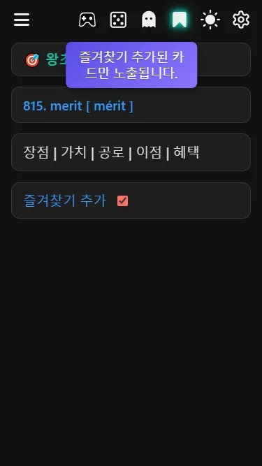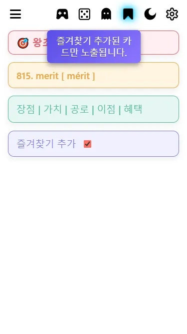 2) 상단의 즐겨찾기(북마크) 아이콘을 클릭해서 암기하고싶은 카드만 따로 집중적으로 암기하실수가 있습니다. 미리 카드들을 즐겨찾기 추가 해놓아야 사용가능합니다.