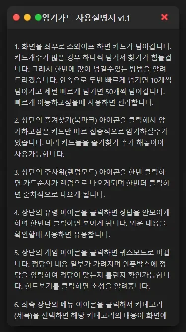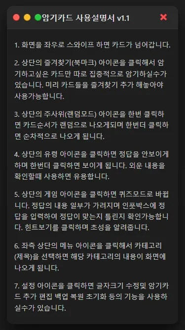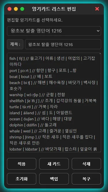11) 설정 >> 암기카드 편집 >> 초기화 버튼을 누르면 전체 카드가 초기 상태로 돌아갑니다. 혹시 자기만의 카드를 이미 많이 만들었다면 초기화 전에 백업을 먼저 해두셔야 합니다. 잃어버린 데이터는 책임지지 않습니다.