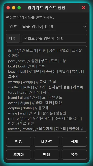 8) 설정 >> 암기카드 편집 >> 새카드 버튼을 눌러서 자기만의 암기카드를 생성할수가 있습니다.