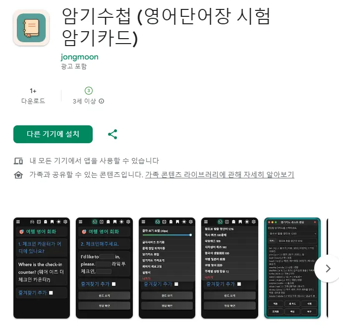→ 이 앱은 영어 단어 외에도 일본어, 중국어, 역사, 성경 구절 등 다양한 콘텐츠를 지원하여 한 가지 앱으로 여러 과목을 통합 학습할 수 있습니다.