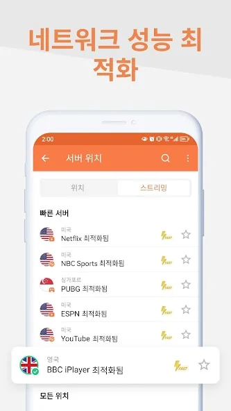 • 빠른 서버 네트워크를 통해 모든 스트리밍 서비스(Netflix, Hulu, Amazon Prime Video, Disney+, BBC iPlayer 등)에서 영화, 스포츠 경기, 비디오를 스트리밍하세요.