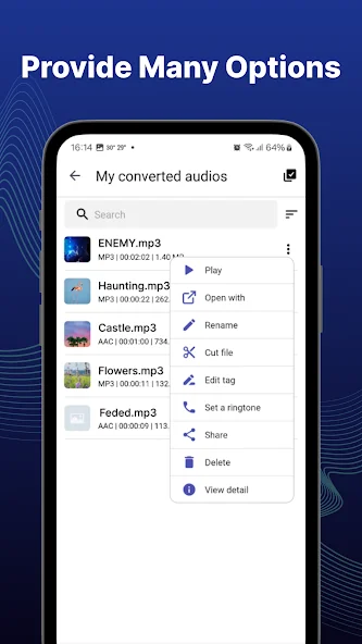 - MP3, AAC, AC3, WMA, FLAC, WAV, OGG 또는 OPUS 등 다양한 오디오 형식을 제공합니다.